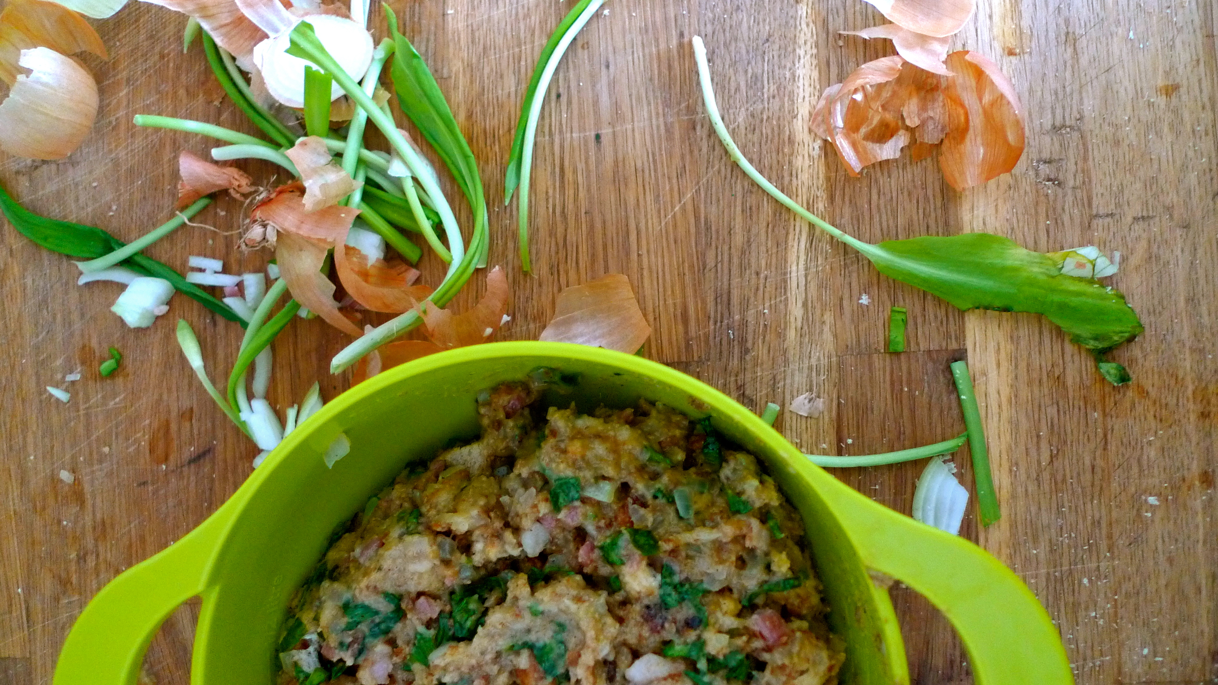 Für die Knödel: 10 Scheiben (Mehrkorn)Toastbrot – Butter – 1-2 Zwiebeln – ca 120g gewürfelter Speck – 100ml Milch – 100g Bärlauch, bzw nach Geschmack – 2 Eier – Salz – Pfeffer