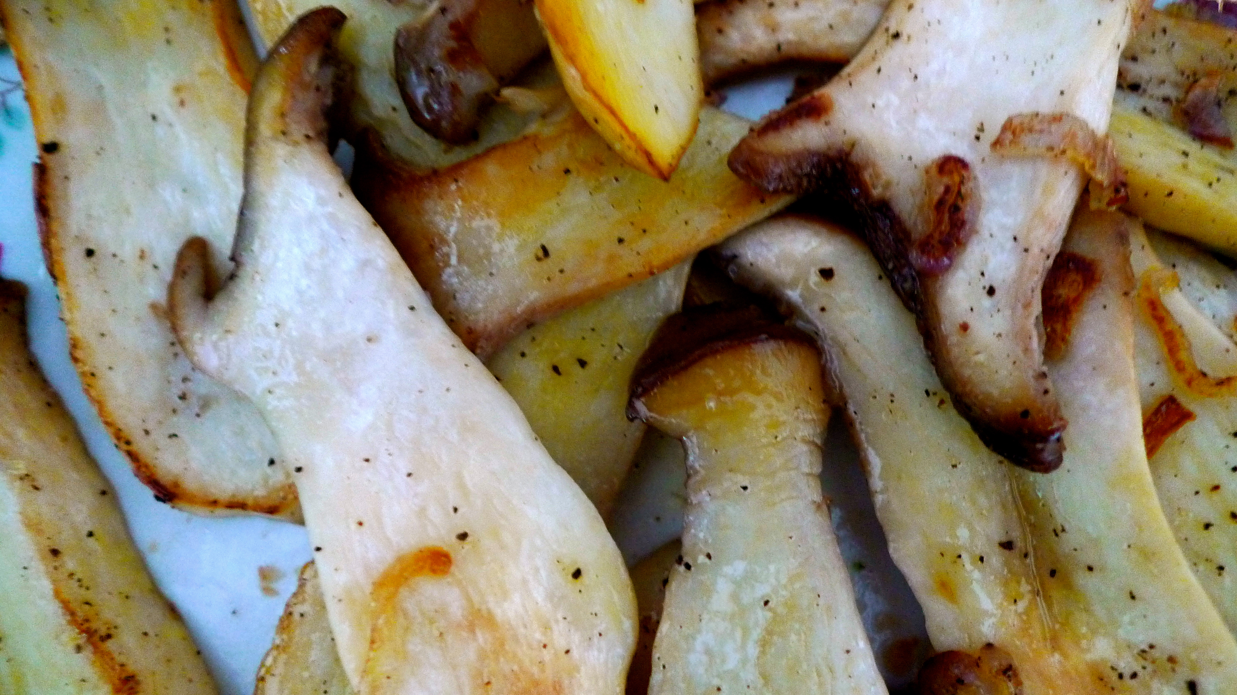 Jetzt schlägt die Stunde der Waldschönheiten. Die Kräuterseitlige in ca 0,5mm dicke Scheiben schneiden und (gegebenenfalls portionsweise) in Olivenöl golden anbraten – die Pilze sollten noch Biss haben. Zum Schluss etwas salzen und pfeffern, aus der Pfanne nehmen und beiseite stellen.
