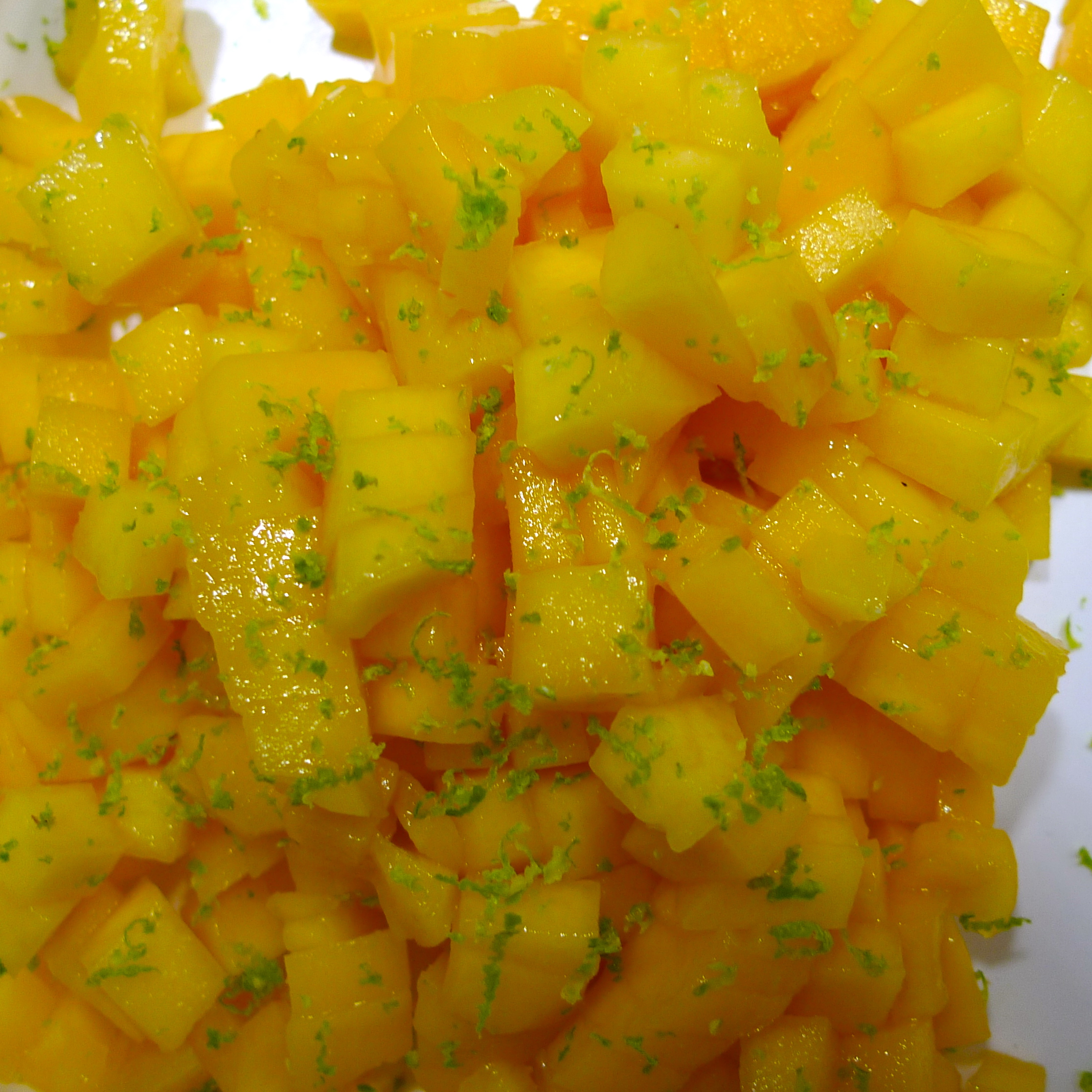 Mango klein würfeln, mit einem guten EL Zucker, dem Saft, und der abgeriebenen Schale von der Limette mischen und ziehen lassen.