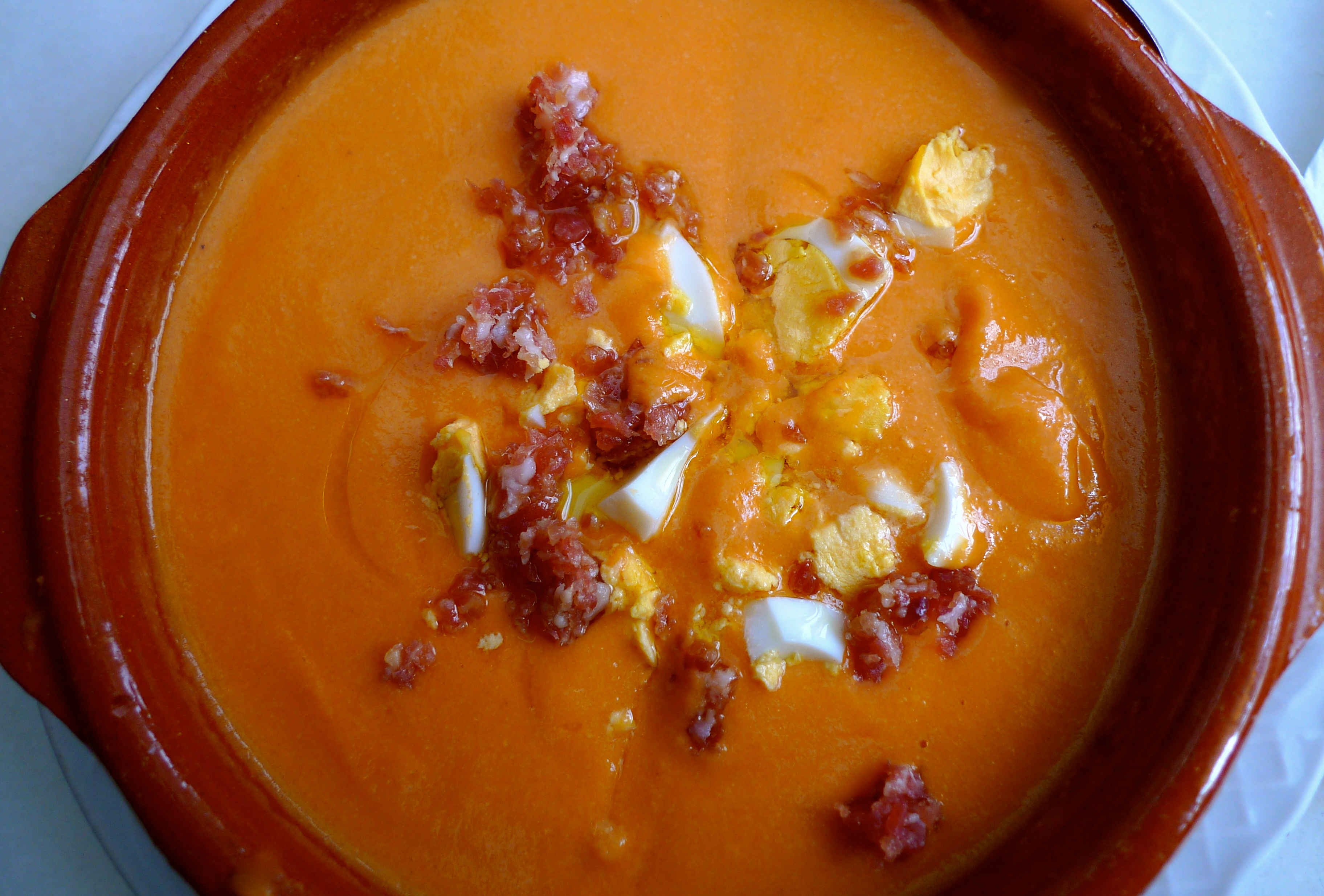 Erst Salmorejo (l.), eine kalte Suppe, geschmacklich einer Gazpacho sehr ähnlich, nur etwas dicker, weil zusätzlich Weißbrot mit püriert wird. Garniert wird mit Speck und gekochtem Ei. Schmeckt mir sehr gut, fruchtig, erfrischend.