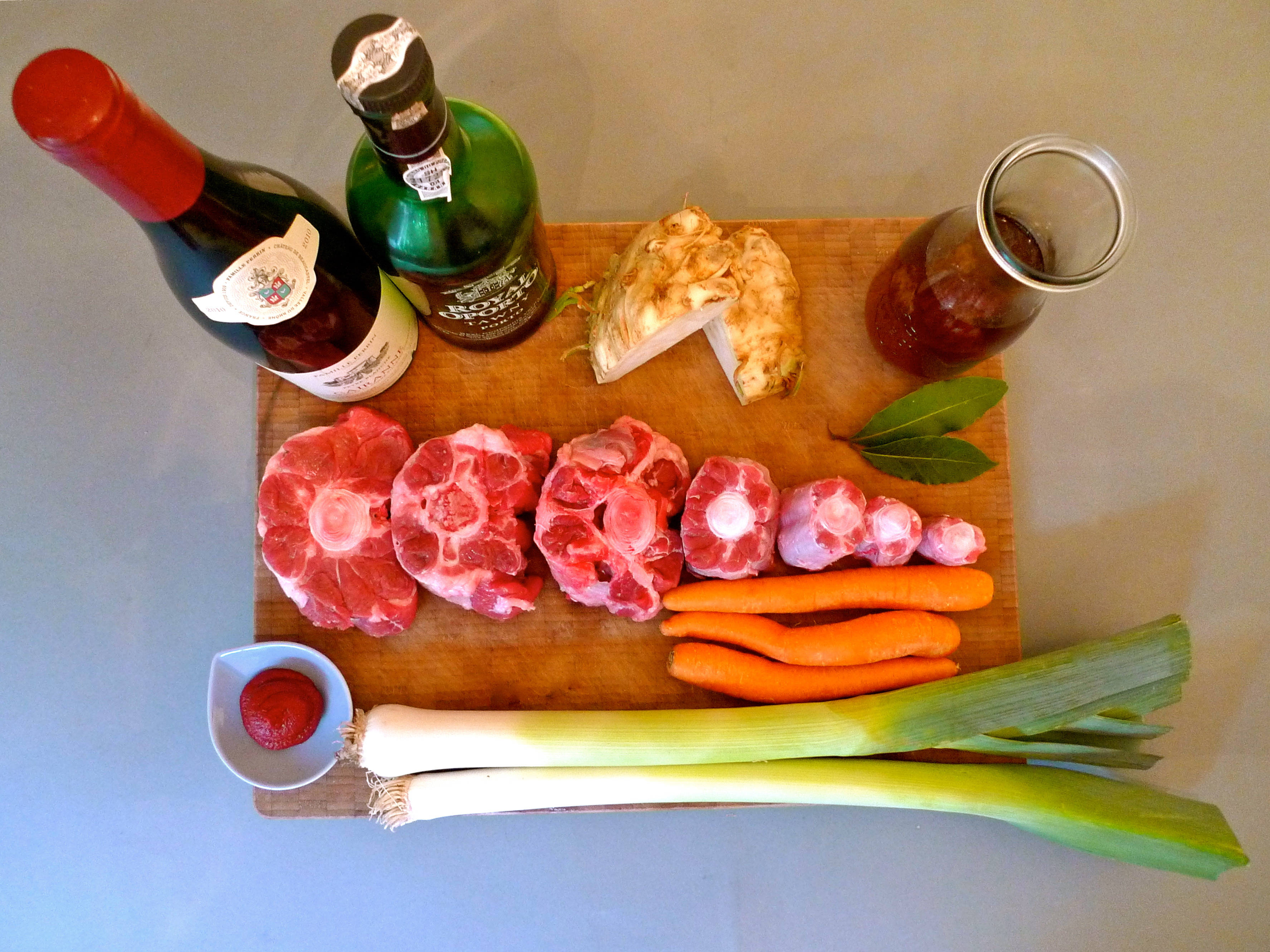 Ochsenschwanz, ca. 1,3kg, (beim Metzger vorbestellen und in ca 4cm dicke Scheiben teilen lassen), zwei Stangen Lauch, ein gutes Stück Sellerie, 4 – 5 Möhren, 2 Lorbeerblätter, Tomatenmark, kräftiger Rotwein, roter Portwein, 500ml Rinder- oder Kalbsfond, Olivenöl, 1 EL Apfelessig, Salz, Pfeffer, Zucker